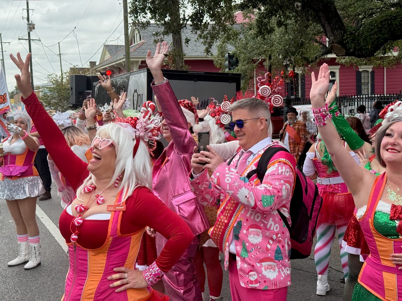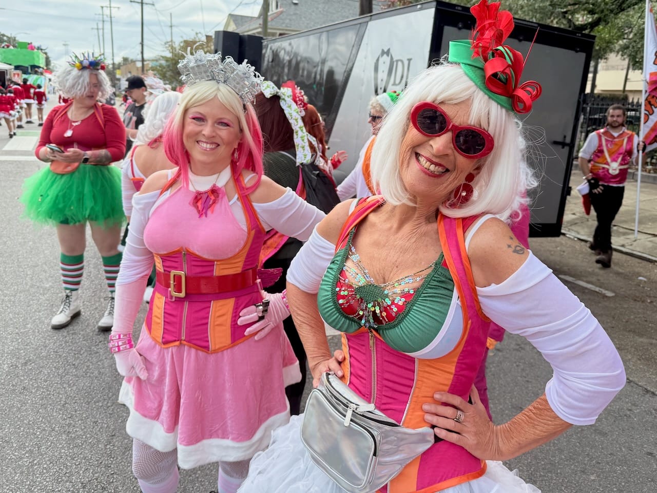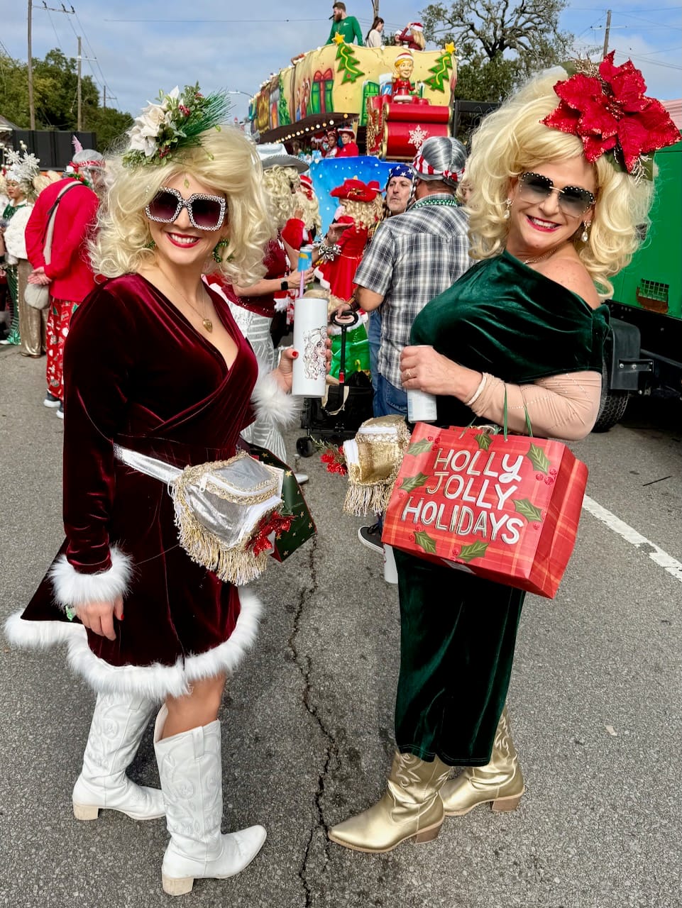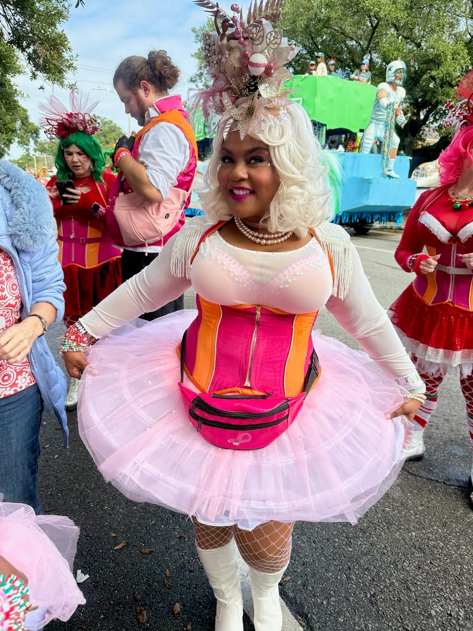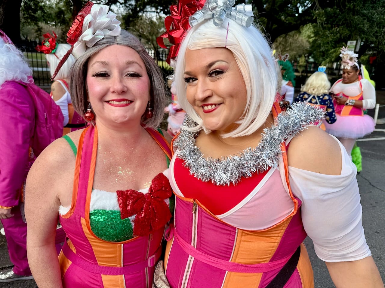 Since 2013, I 've been dancing in holiday parades with the Pussyfooters – a non-profit group of over 100 women over-30 who parade and serve the community in pink corsets and white combat boots. When the pandemic ended the Krewe of Jingle Parade, and the Manning Family's Children's Hospital Holiday Parade began 4 years ago, the addition of giant balloons was not the only change. Like the Pride and Krewe of Boo parades, the floats are now sponsored by corporations and/or local businesses to help pay for everything. (Mardi Gras and most local parades are paid for by the people riding in the floats and throwing gifts. MORE INFO)