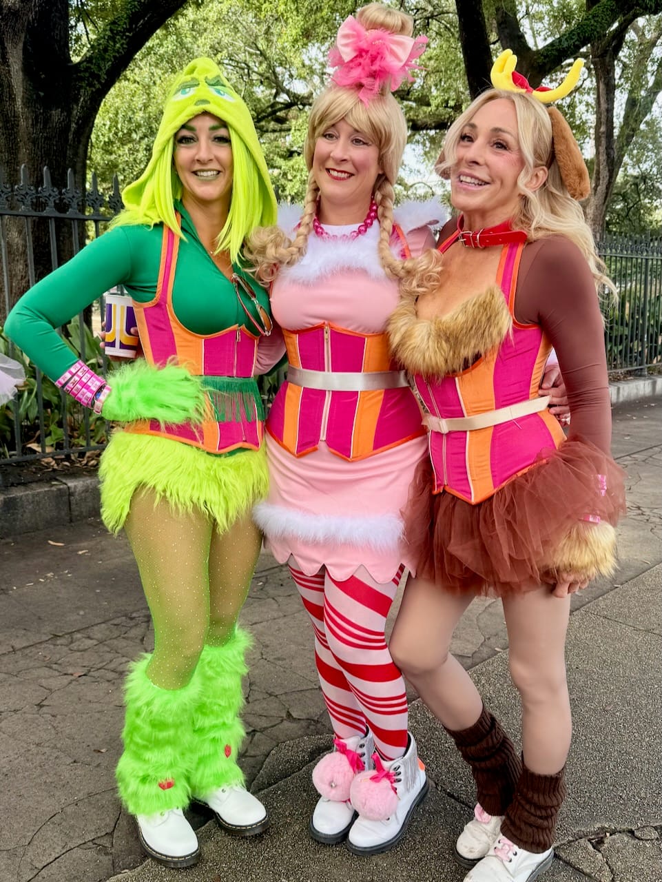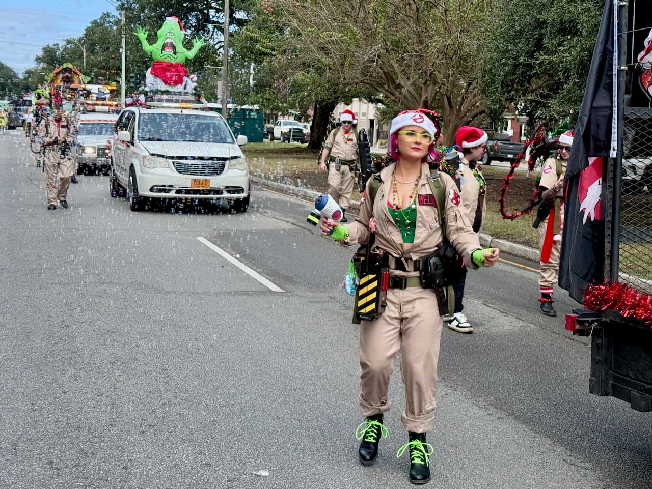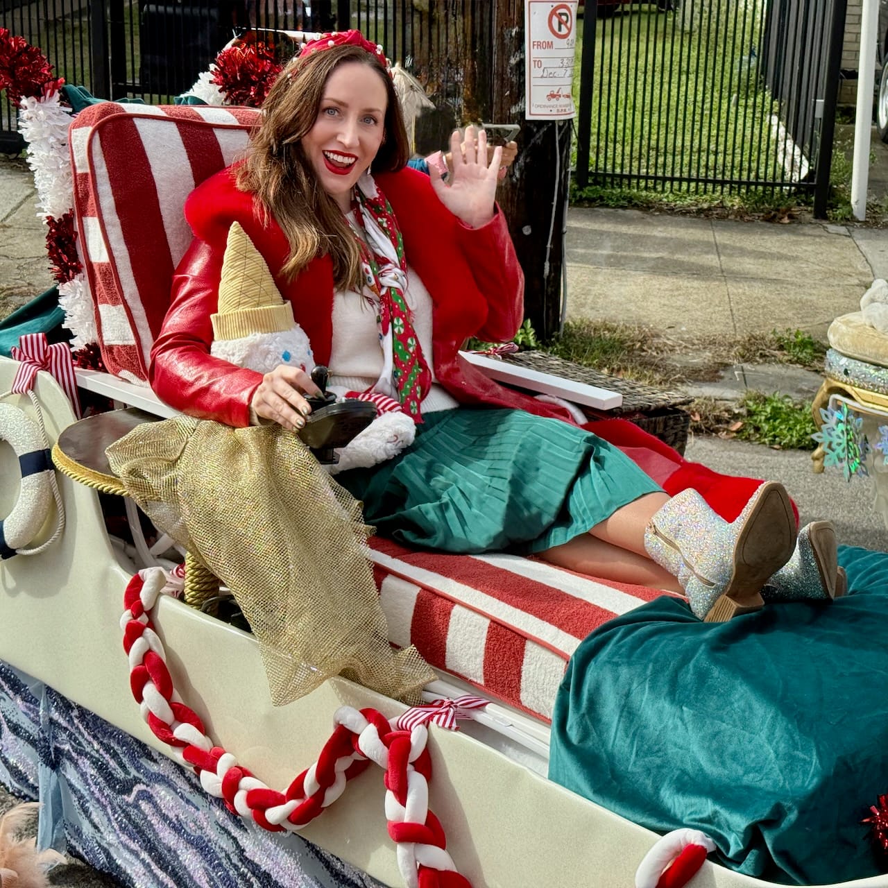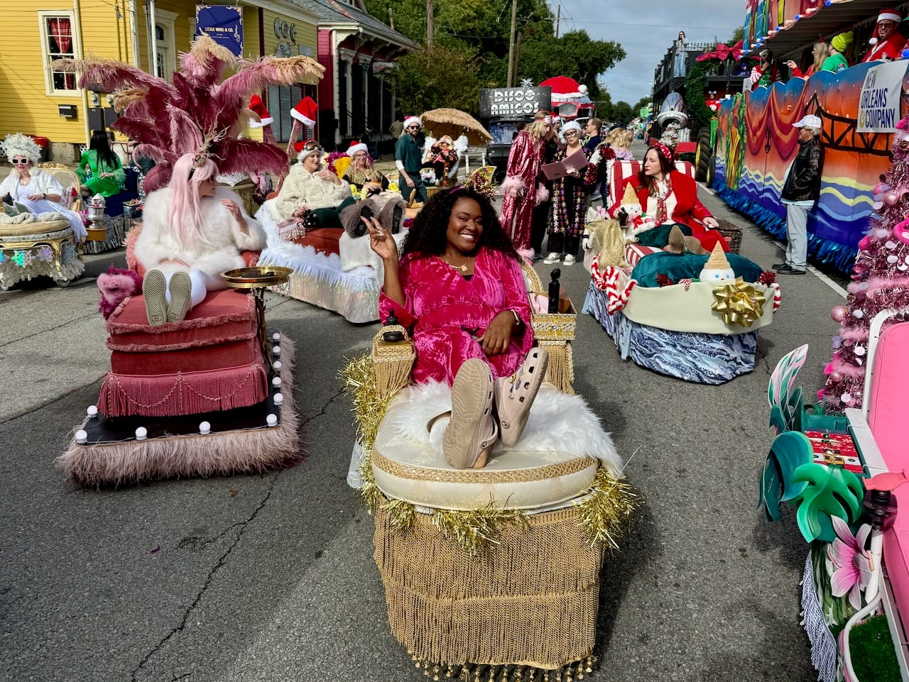 Since 2013, I 've been dancing in holiday parades with the Pussyfooters – a non-profit group of over 100 women over-30 who parade and serve the community in pink corsets and white combat boots. When the pandemic ended the Krewe of Jingle Parade, and the Manning Family's Children's Hospital Holiday Parade began 4 years ago, the addition of giant balloons was not the only change. Like the Pride and Krewe of Boo parades, the floats are now sponsored by corporations and/or local businesses to help pay for everything. (Mardi Gras and most local parades are paid for by the people riding in the floats and throwing gifts. MORE INFO)