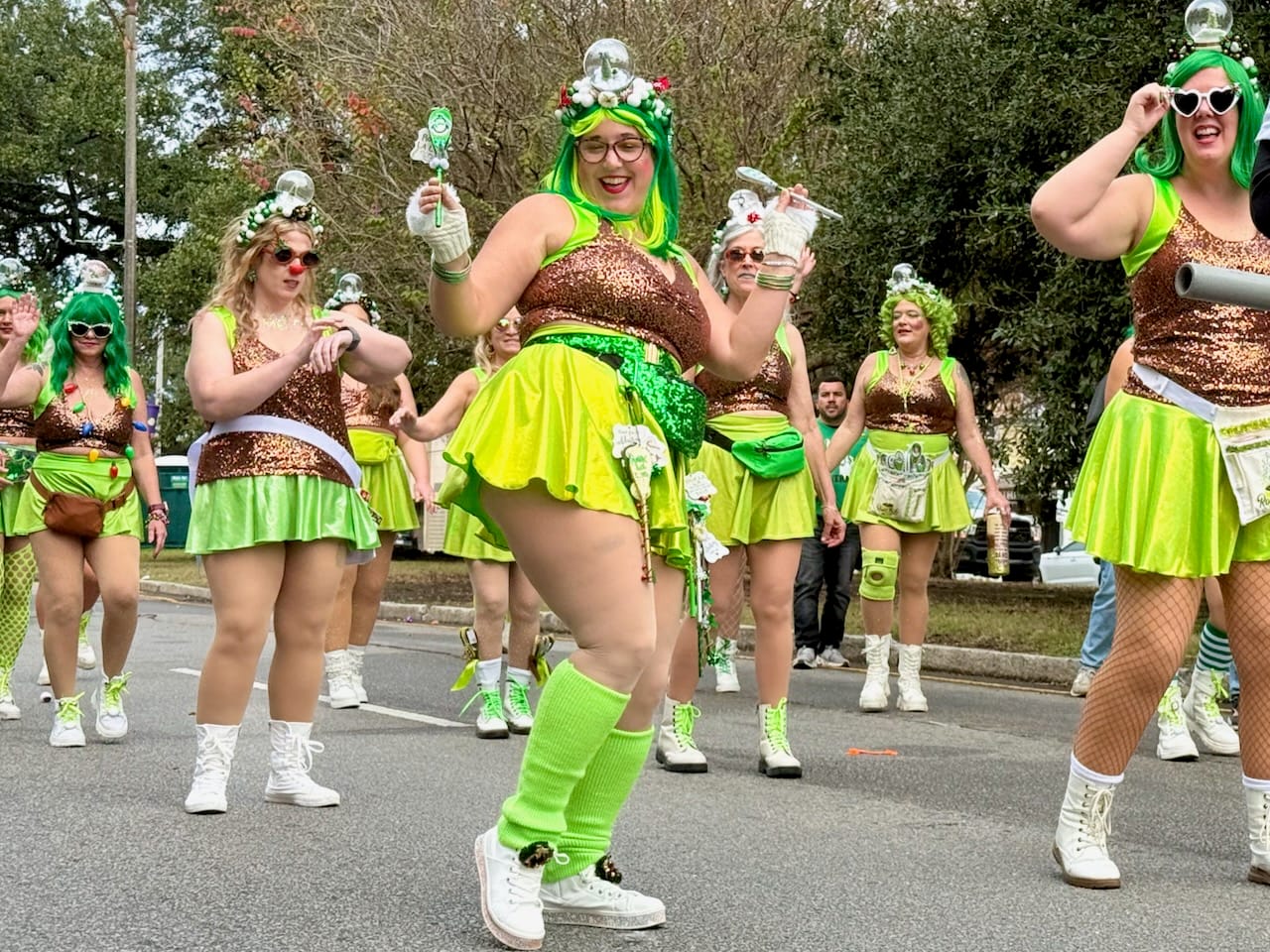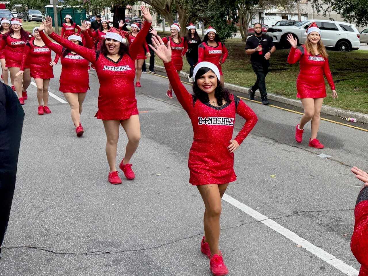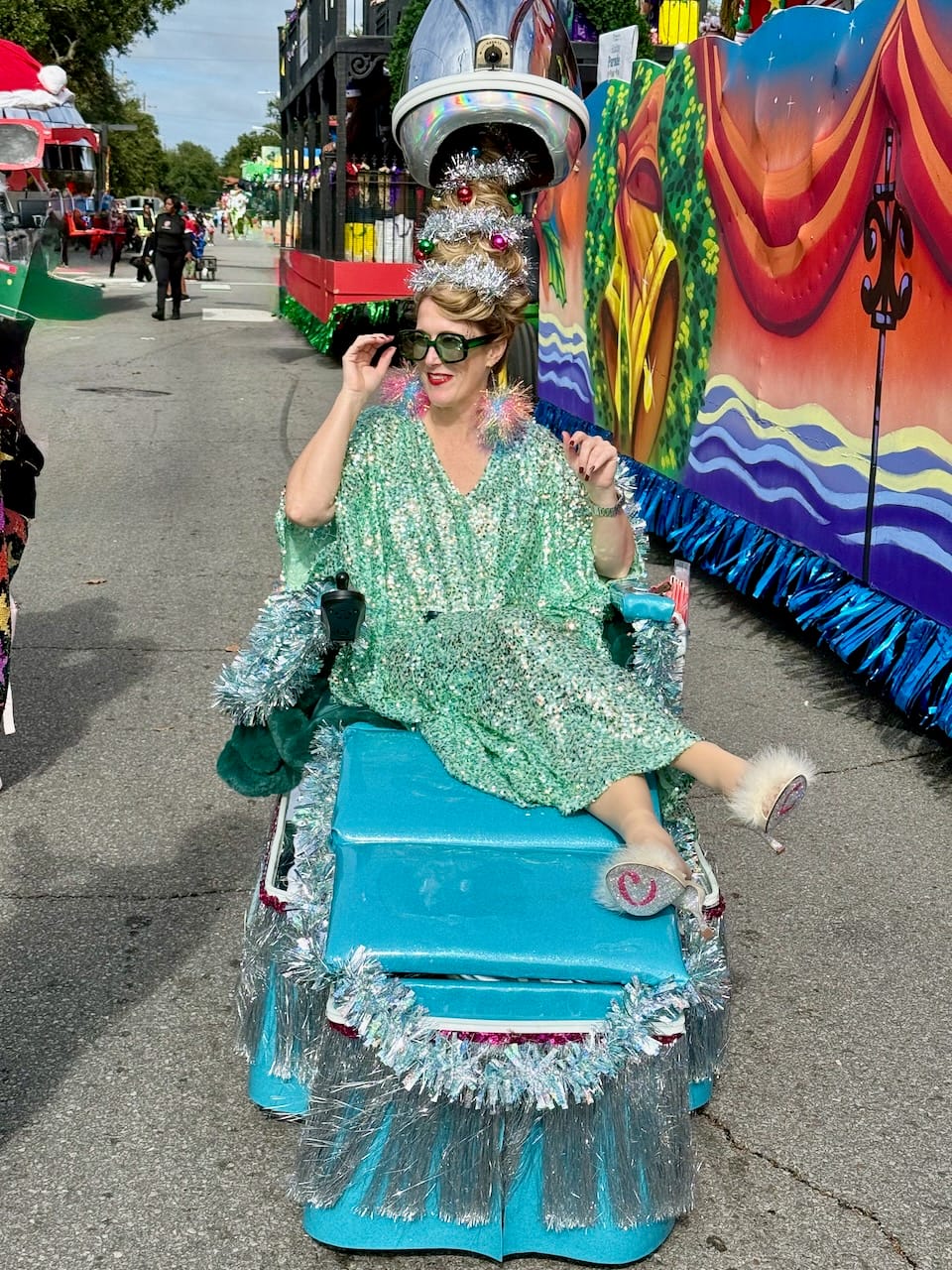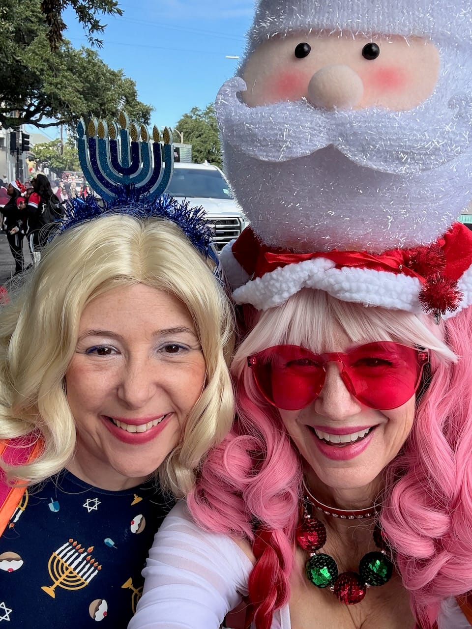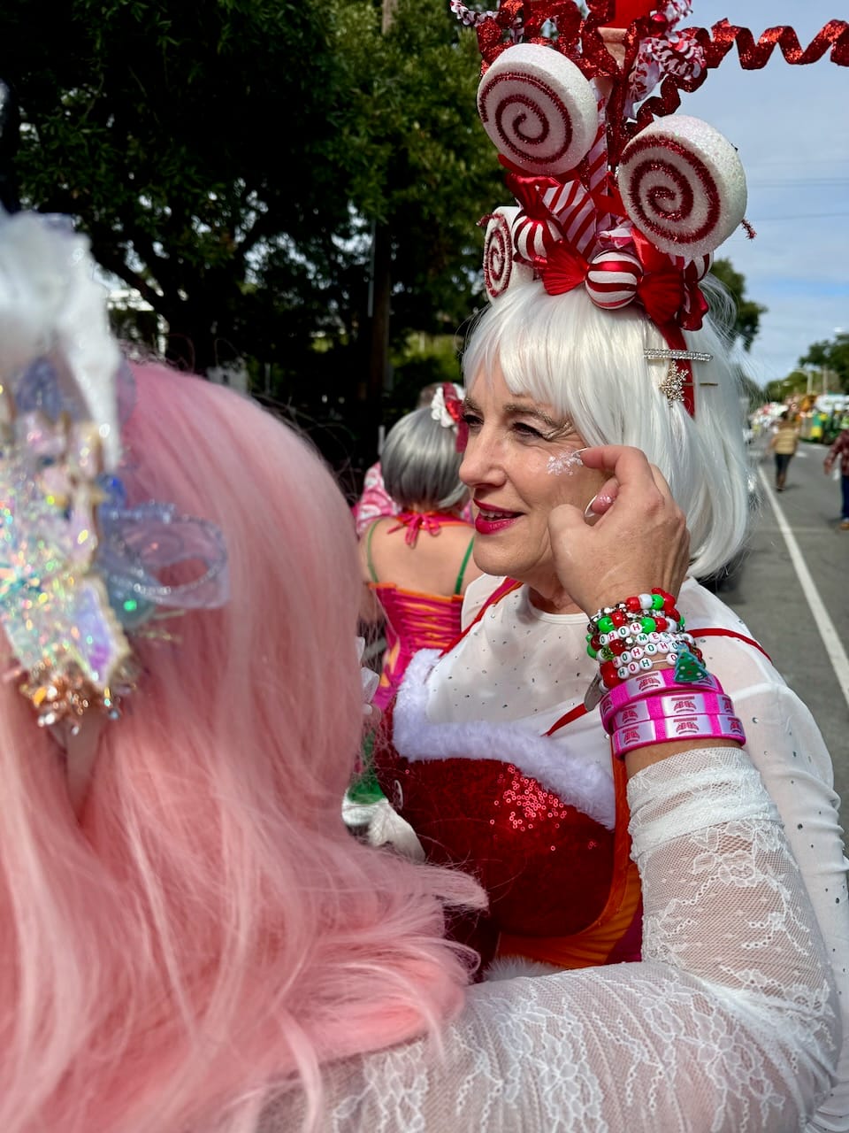 Since 2013, I 've been dancing in holiday parades with the Pussyfooters – a non-profit group of over 100 women over-30 who parade and serve the community in pink corsets and white combat boots. When the pandemic ended the Krewe of Jingle Parade, and the Manning Family's Children's Hospital Holiday Parade began 4 years ago, the addition of giant balloons was not the only change. Like the Pride and Krewe of Boo parades, the floats are now sponsored by corporations and/or local businesses to help pay for everything. (Mardi Gras and most local parades are paid for by the people riding in the floats and throwing gifts. MORE INFO)