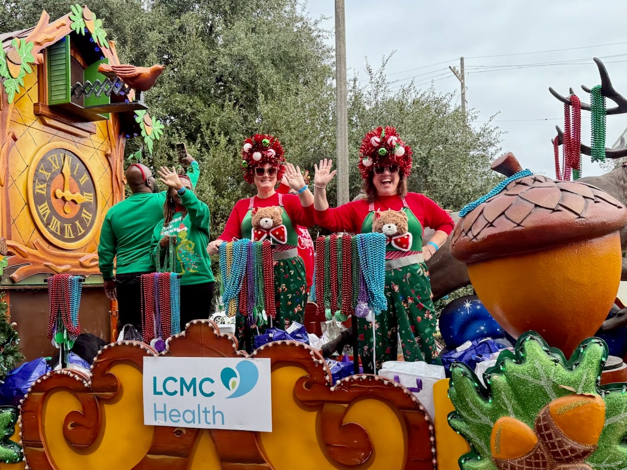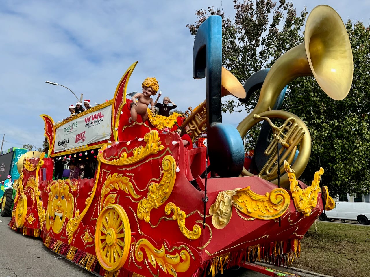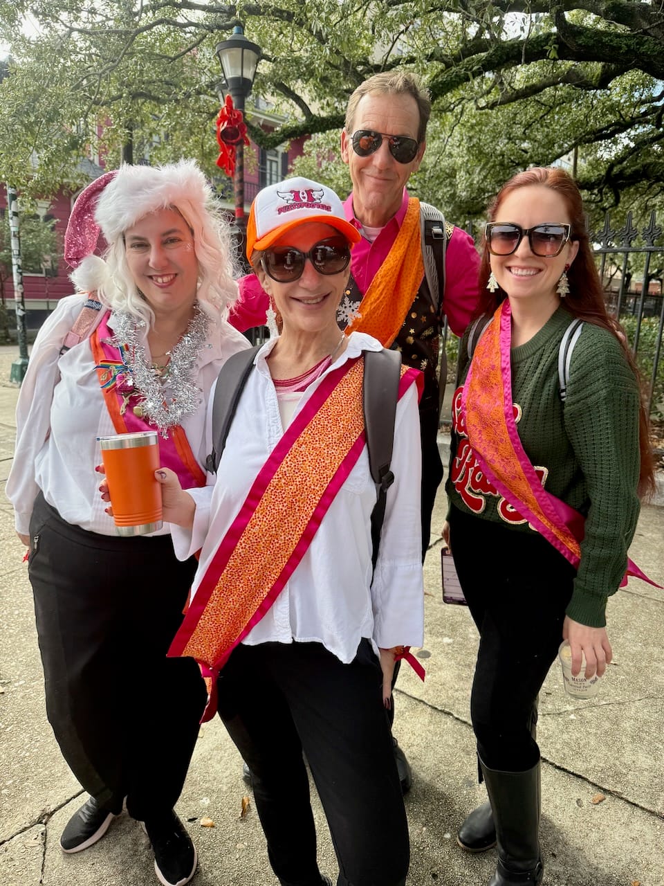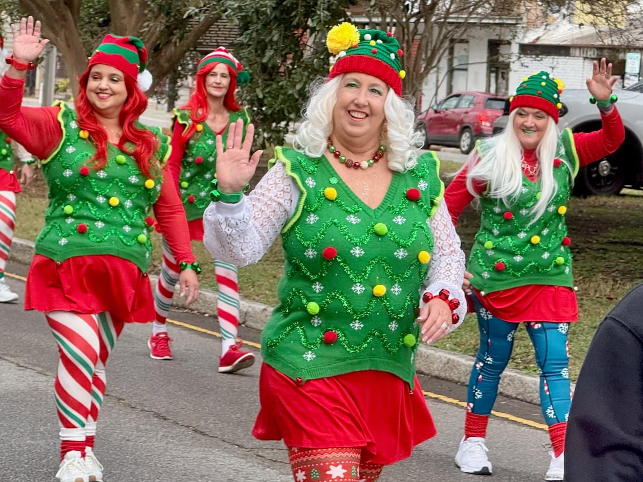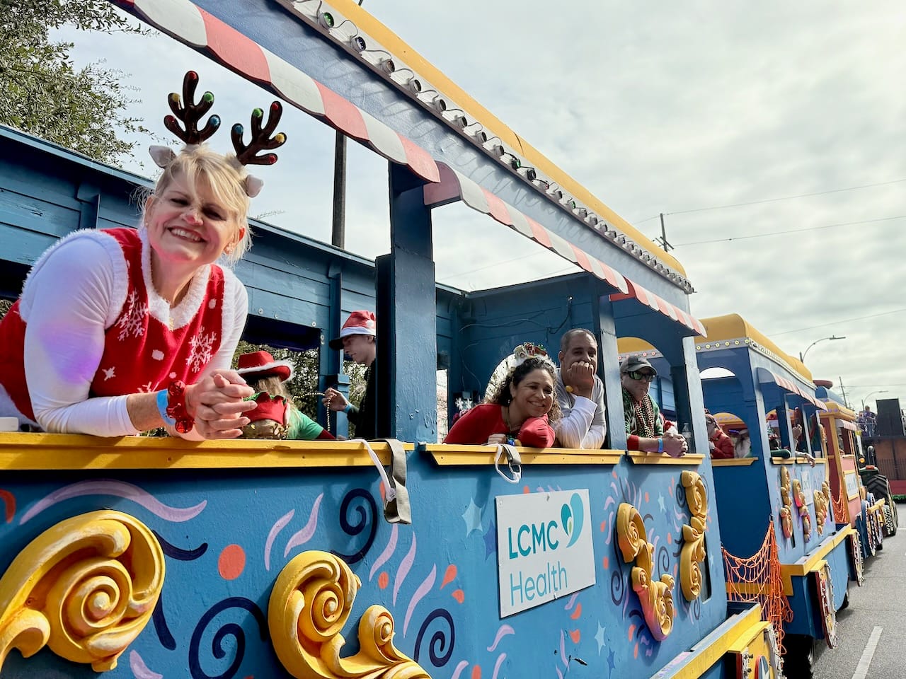 Since 2013, I 've been dancing in holiday parades with the Pussyfooters – a non-profit group of over 100 women over-30 who parade and serve the community in pink corsets and white combat boots. When the pandemic ended the Krewe of Jingle Parade, and the Manning Family's Children's Hospital Holiday Parade began 4 years ago, the addition of giant balloons was not the only change. Like the Pride and Krewe of Boo parades, the floats are now sponsored by corporations and/or local businesses to help pay for everything. (Mardi Gras and most local parades are paid for by the people riding in the floats and throwing gifts. MORE INFO)