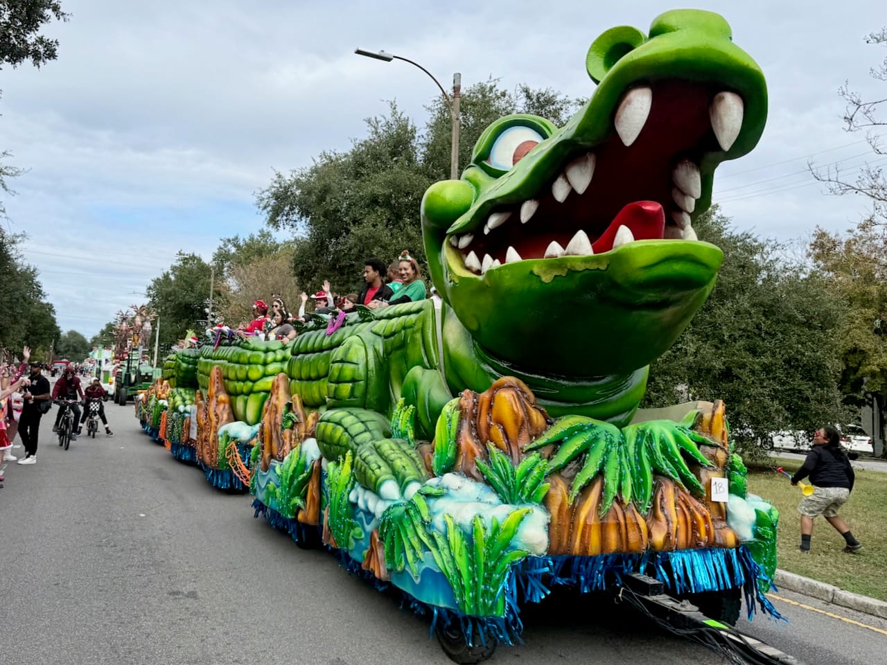 Between the weather-move and the Saints game the parade competed with, the crowds were a bit thinner this year. But the kids (and kids at heart) were just as enthusiastic as ever. Kern Studios' New Orleans and Louisiana-centric floats included alligators, Mr. Bingle, and other local iconography. Dance krewes included Krewe of Dolly, Muff-A-Lottas, Roux La La, NOLA Bombshells, and the women who started it all – the Pussyfooters!