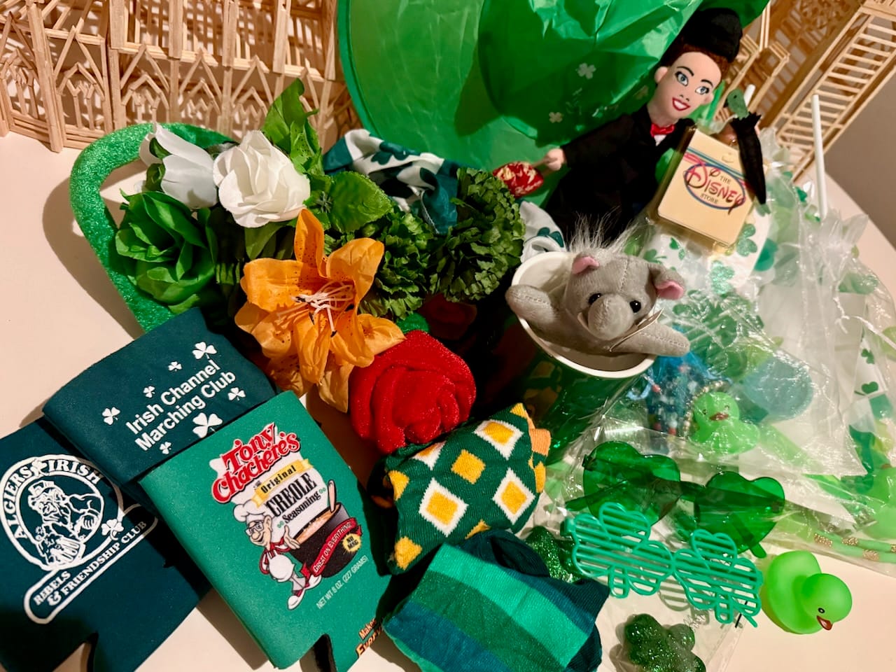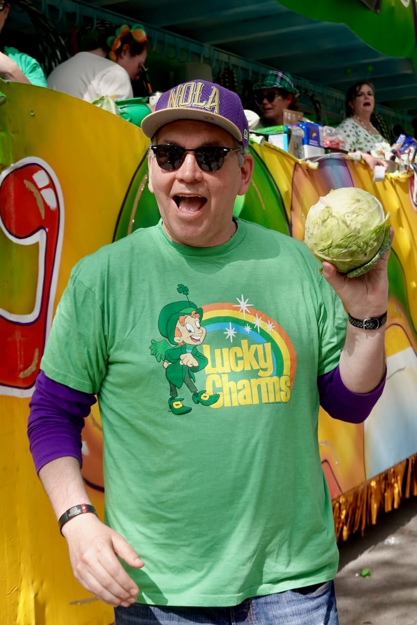 More of a community event than a representation of Irish culture, the parade is best known for helping us make groceries. In addition to beads and toys, riders throw cabbage, carrots, potatoes, onions, ramen noodles and other stew ingredients – as well as candy, sandwich cookies, Moon Pies, pickles, jello shots, Lucky Charms cereal. Non-edible items included socks, scarves, sunglasses, stuffies, coozies, rubber duckies, and Irish Spring soap. I was even handed a large shamrock-embossed coffee mug.