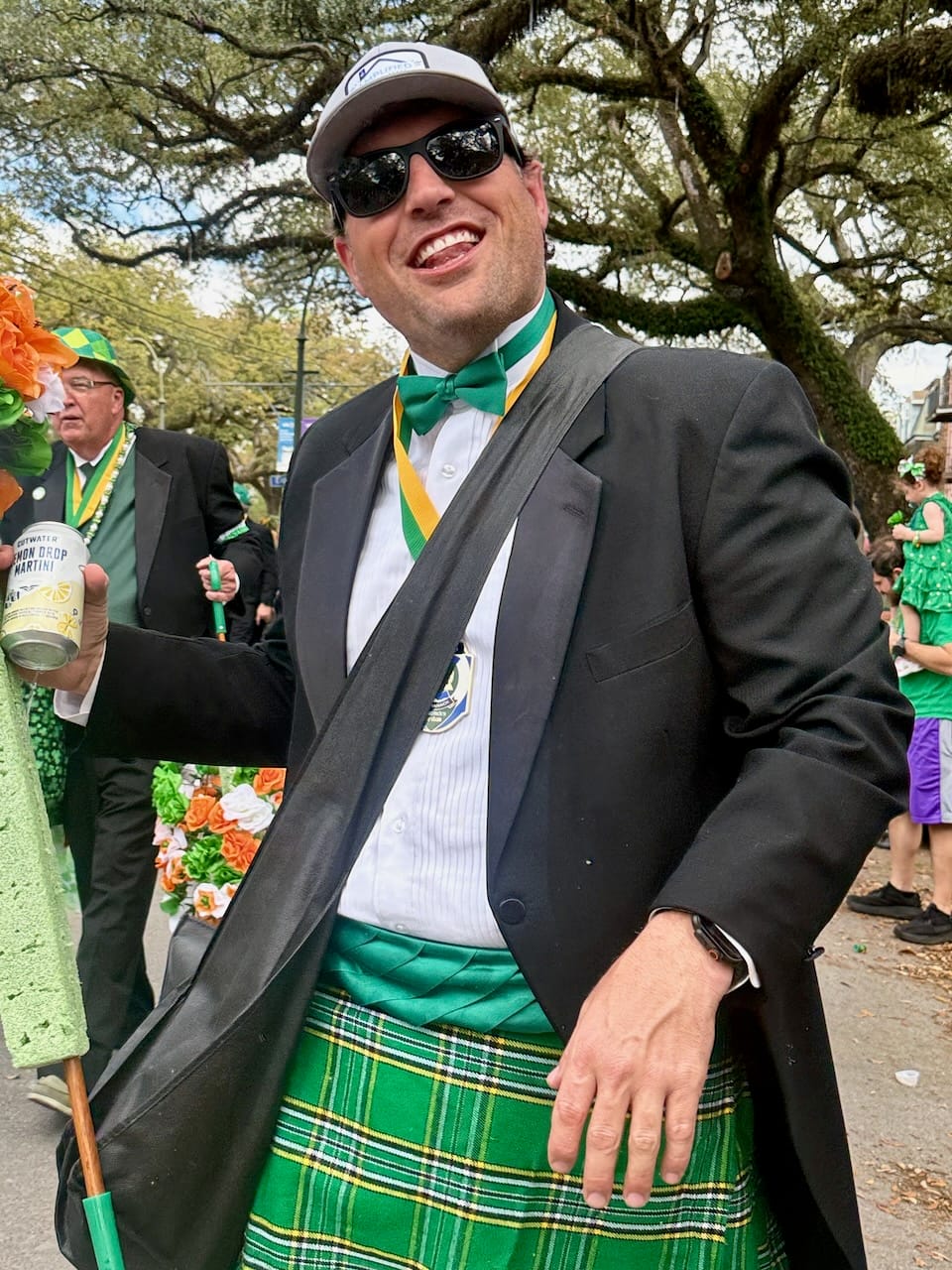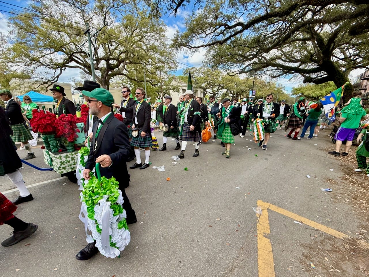 The parade features over-1400 walkers wearing black suits and/or kilts with green accessories, who exchange kisses (mostly on the cheek) for silk flowers and other mementos.